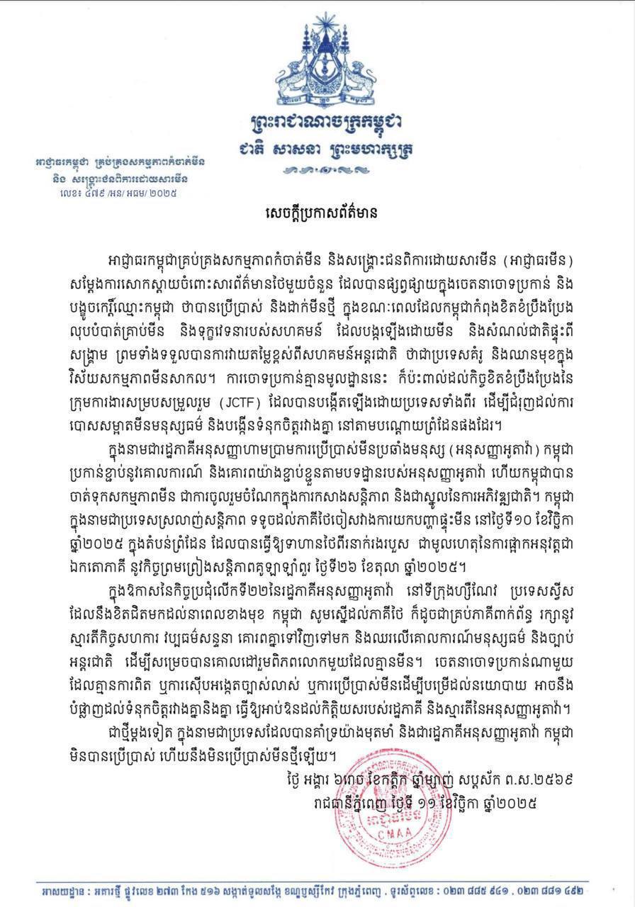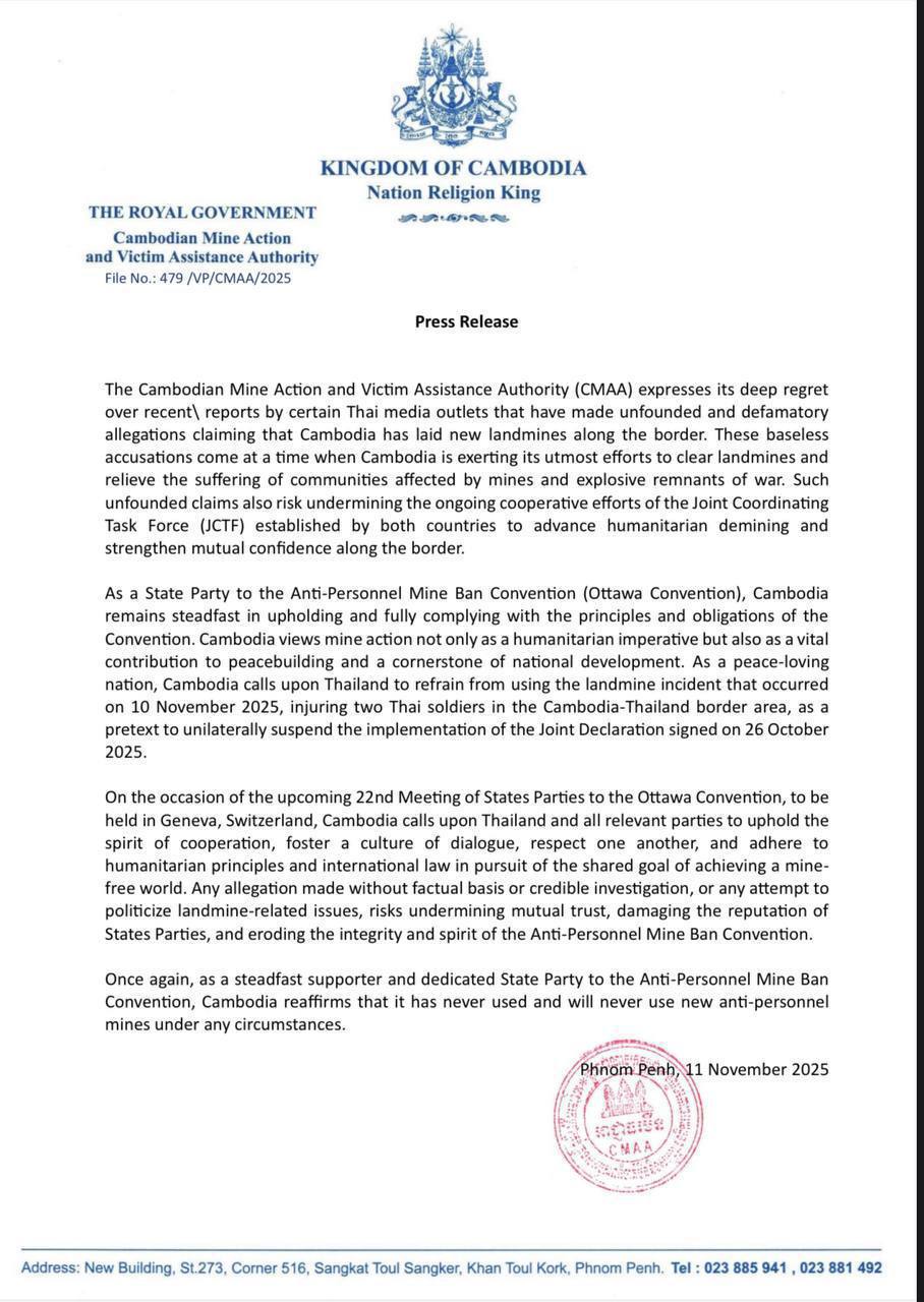 អាជ្ញាធរមីន សម្តែងការសោកស្តាយចំពោះសារព័ត៌មានថៃមួយចំនួន ដែលបានផ្សព្វផ្សាយក្នុងចេតនាចោទប្រកាន់ និងបង្ខូចកេរ្តិ៍ឈ្មោះកម្ពុជា ថាបានប្រើប្រាស់ និងដាក់មីនថ្មី ក្នុងខណៈពេលដែលកម្ពុជាកំពុងខិតខំប្រឹងប្រែងលុបបំបាត់គ្រាប់មីន និងទុក្ខវេទនារបស់សហគមន៍ ដែលបង្កឡើងដោយមីន និងសំណល់ជាតិផ្ទុះពីសង្គ្រាម ព្រមទាំងទទួលបានការវាយតម្លៃខ្ពស់ពីសហគមន៍អន្តរជាតិ ថាជាប្រទេសគំរូ និងឈានមុខក្នុងវិស័យសកម្មភាពមីនសាកល។ ការចោទប្រកាន់គ្មាន