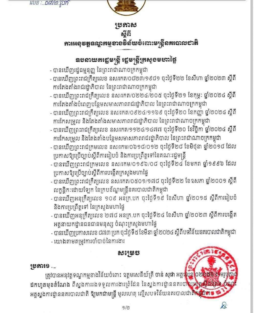 ត្រូវបានផ្អាកការងារបណ្តោះអាសន្នចំពោះ វរសេនីយ៍ទោ ចាន់ សុធា អត្តលេខ ៥៦៩៤៥ មេបញ្ជាការរង វរសេនាតូចនគរបាលការពារព្រំដែនគោកលេខ៧០១ នៃស្នងការដ្ឋាននគរបាលខេត្តស្ទឹងត្រែង ចំណុះអគ្គស្នងការដ្ឋាននគរបាលជាតិ មូលហេតុ ល្មើសបទវិន័យនគរបាលជាតិ។
