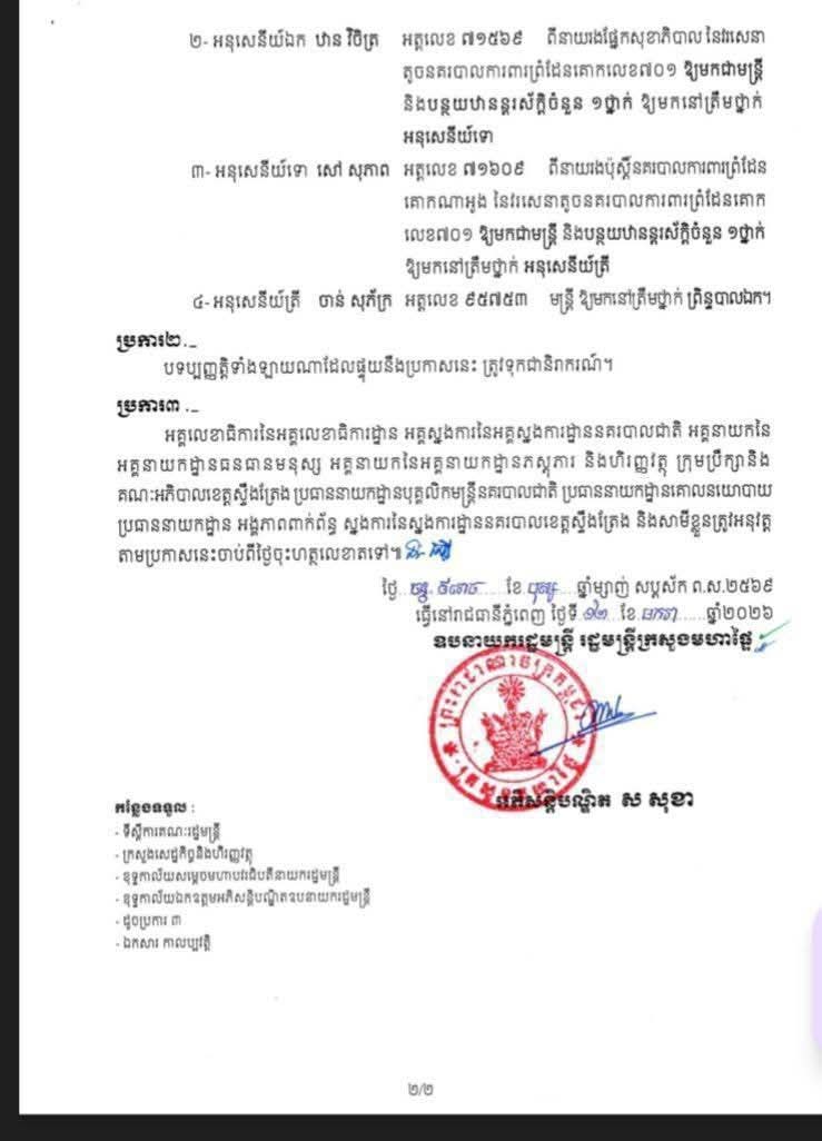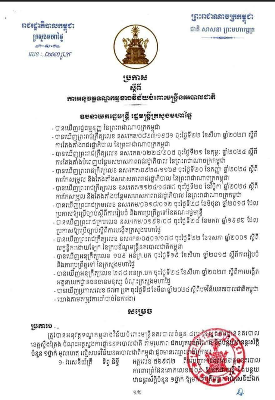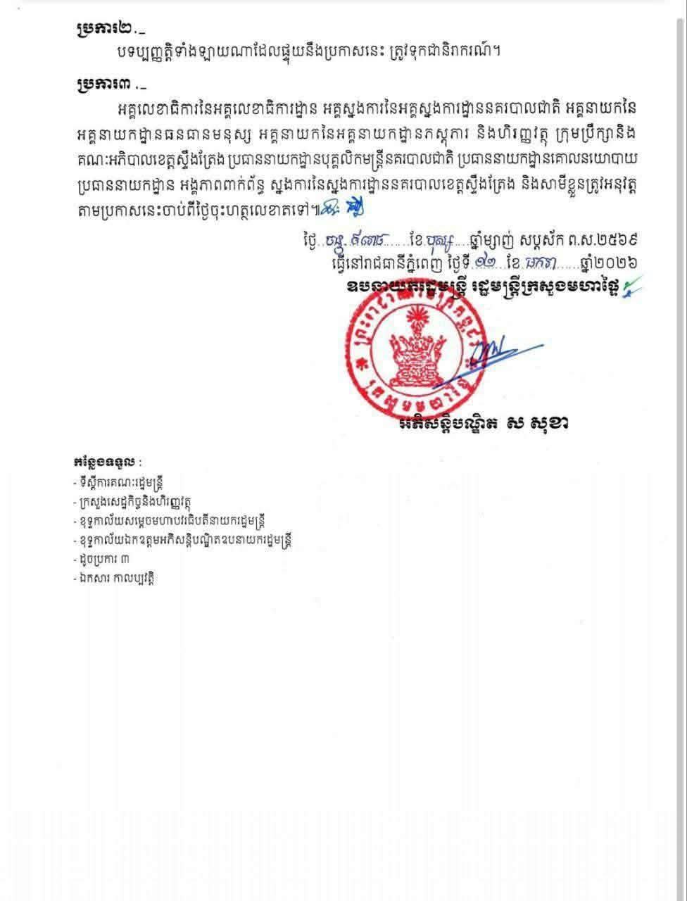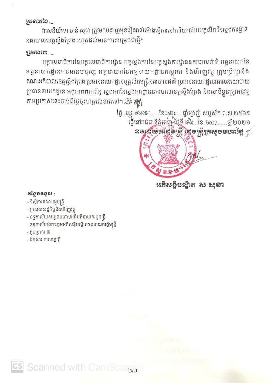 ខេត្តស្ទឹងត្រែង ៖ ឯកឧត្តមអភិសន្តិបណ្ឌិត ស សុខា ឧបនាយករដ្ឋមន្ត្រី រដ្ឋមន្ត្រីក្រសួងមហាផ្ទៃ បានសម្រេចដកហូតមុខតំណែង នគរបាលបាលខេត្តស្ទឹងត្រែង ចំនួន៦រូប